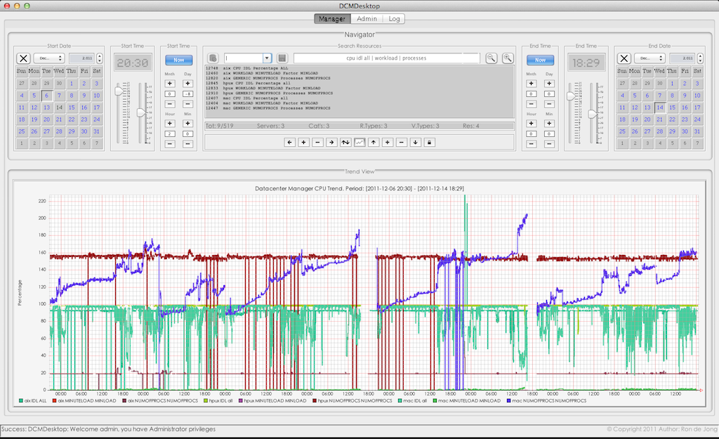 The DCM Navigator is a highly powerful search instrument, allowing you to select an absolute or relative period in time and any number of server-resources searching: “cpu” or “server1 diskio” or “solaris storage” and the next moment, you have your exact trend analysis or performance stats. Searching for CPUIDLE (in general) gives you a single line-graph with e.g. hundreds of servers showing you instant datacenter CPU performance over any required period and value scale.