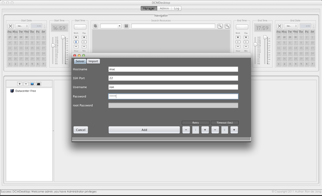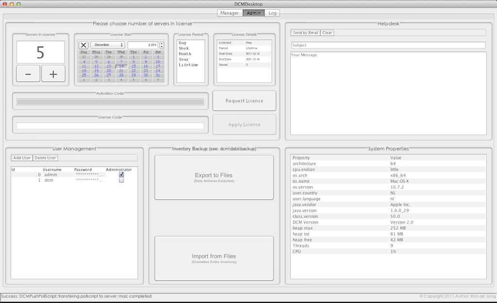 The DCMStarter allowing you to start the different DatacenterManager applications The DCMDesktop [Inventory View] (the all in one standalone desktop application) The DCMDesktop [Import Servers] (CSV File) The DCMDesktop [Admin] The DCMCommander allows you to mass command or execute a shell-script on all your servers in seconds The DCMLogger allowing you to get detailed information on DatacenterManager activities The DCMClient [Logon Window] The DCMClient basically looks the same as DCMDesktop, but connects to the central DCMServer Please download the User Manual for more information. |